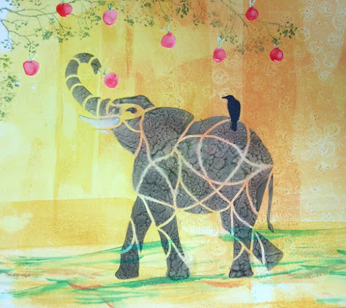 I firmly taped my elephant stencil down with some masking tape. I swept some texture paste over the stencil with a palette knife, I wanted to give the elephant a cracked rough elephant type skin so I used a sponge (an inexpensive make up sponge) and pressed it into the paste and then quickly lifted it up. I have never used crackle paint, but you could probably create the same appearance with that.